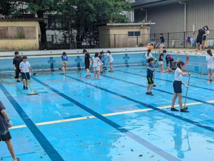 プールの中以外にも腰洗い槽や目洗い場などもきれいにしようと頑張っていました。5時間目が終わり、最初とは見違えるほどきれいになったプールを見て「もう少しやし、もっとしたい。」と名残惜しそうでした。残りは6年生にバトンタッチです。教室に戻ってから「自分らできれいにしたからプールに入るのが今から楽しみ。」とプール清掃に達成感と充実感を感じているようでした。