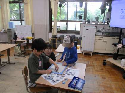 新しいパズルを見つけ、やりたくなった1年生の二人。