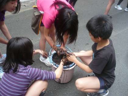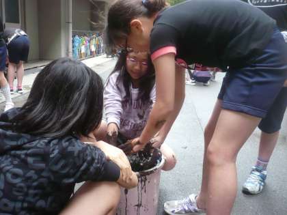 総合的な学習の時間(さくら学習)でお米のひみつを学習していきます。そのためにまずは,お米がどのようにできるのかを実際に育てていくことになりました。田んぼでの田植はできませんが,バケツを使って稲を育てる「バケツ稲」に挑戦します。バケツの中に泥を作り,手で混ぜて田んぼの感触も味わいました。大きく育つのが楽しみです。