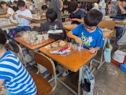 図工の『水から発見!ここきれい』の題材で水を使って学習しました。透明のケースに入れたり、上に垂らしてみたり、色を付けたりいろいろ試しました。それをカメラでパシャリ。水のきれいな表情を写真におさめることができました。