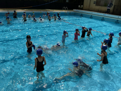水中じゃんけんをしたり宝さがしなどたくさんの遊びの中で、水に慣れ、水の中で思い切り活動できるようにしています。