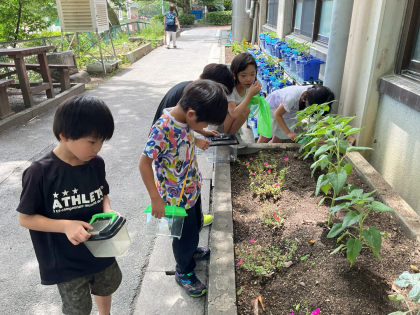 ダンゴムシやモンシロチョウの幼虫、ダンゴムシなどを見つけ、「どんなすみかがひつようかな?」「エサはなにかな?」と調べながら育てています。