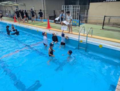 あいにくの空模様でしたが、水泳をする時間は雨の止み間に入っていて、水泳学習をすることができました。今日は“ねらい2”でヒントカードも使いながら、バディでアドバイスをし合って練習を進めていきました。少しずつできるようになってきています。