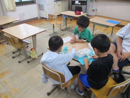 午後からの学習では、低学年の子どもたちは、粘土で造形遊びをしました。始めは個別で作っていたのですが3人が一か所に集まり、お寿司屋さんが始まりました。お寿司を作る人、注文する人と役割に分かれて、仲良くごっこ遊びをして楽しんでいました。
