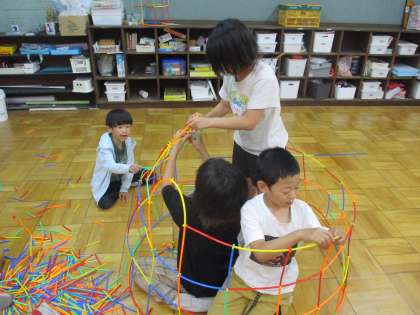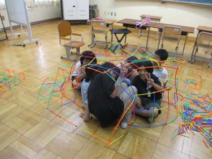 高学年の子どもたち中心に、柔らかい素材のストロー状の物をつないで,家を作りました。柔らかいので,うまくつながないと,天井部分が下がります。根気強くつなぎ,6人が入れる大きさの家を完成させました。