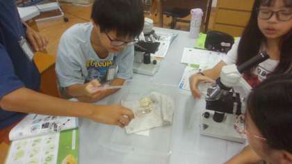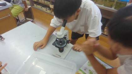 「池のメダカは餌をやらなくても育っているのはなぜ?!」との疑問を解決すべく、池の水を採取してきて、何かいないか顕微鏡で調べました。教科書の微生物の写真を確認してから「何も見えないときもあるから気楽にね」と伝えましたが、しばらくすると「いた!」という歓声が、あちこちで聞こえました。