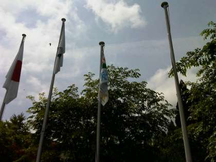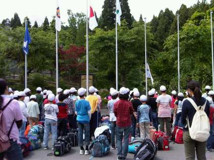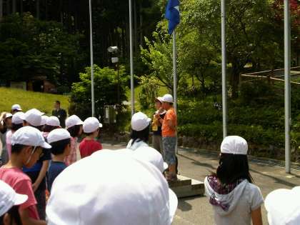 山の家に到着し,早速入所式を行いました。好天のもと,これからの活動の決意をこめて旗をあげました。これからの活動が楽しみです。