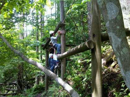 花背山の家の人気の施設。アスレチックに挑戦しています。雨の日や雨上がりにはすべるため使用禁止になる施設ですが,今日は良いお天気で子どもたちは元気にぶら下がったり,渡ったりしています。
