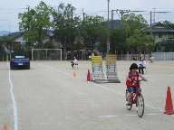 まず,体育館で自転車の安全な乗り方と道を走るときのルールについて,警察の方から説明していただきました。子どもたちは,真剣な眼差しでお話を聞いていました。その後にいつも見慣れた運動場に作られたテスト用のコースで,見本を見せていただきました。すると「難しそう〜。」と言いながらも「早くやりたいな。」とやる気満々になってきていました。