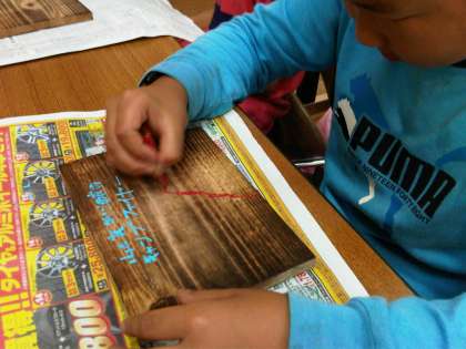 カレーを作ったときに焼いた杉板に思い出の絵や言葉をかいて、記念のプレートをつくります。