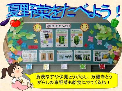 給食では,万願寺とうがらしや伏見とうがらし,賀茂なす,みょうが,トマト,きゅうり,ピーマン・かぼちゃ・ゴーヤ・オクラなどの夏野菜を献立に取り入れています。