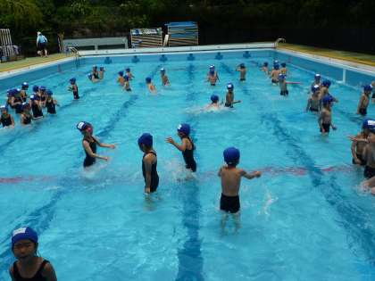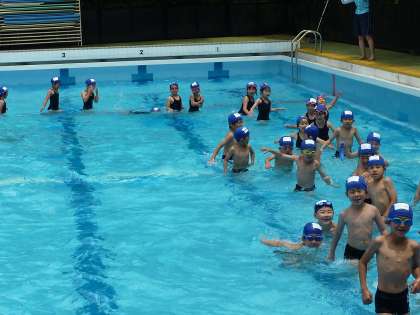 プールの低水位を利用して、水遊びをしました。シャワーの浴び方やプールへの入り方も覚えました。かにさん歩き・もぐりっこなどをした後、人間洗濯機をしました。流れができてみんな大喜びでした。