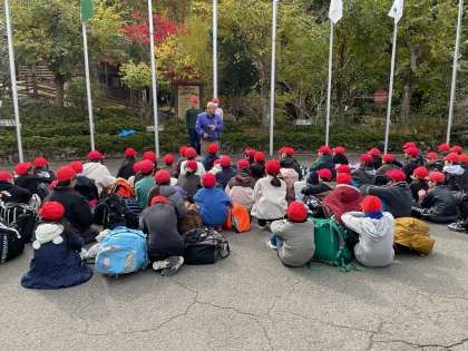 山の家の方にあいさつをし、3日間健康や安全に気をつけて過ごすようにお話していただきました。みんなで作った旗もあげました。