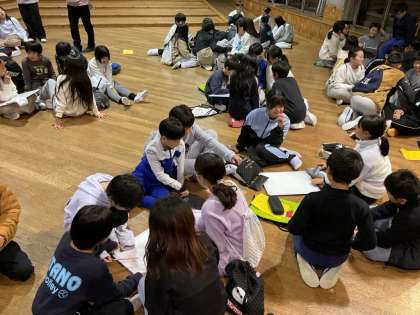 夕食の後、夜の活動では星の観察の予定でしたが、あいにくの曇り空で、星を見ることができませんでした。予定を変更して、オリエンテーションホールで、班対抗のクイズ大会を行いました。子ども達は、班で話し合いながら答えを考えていました。大変盛り上がりました。