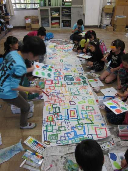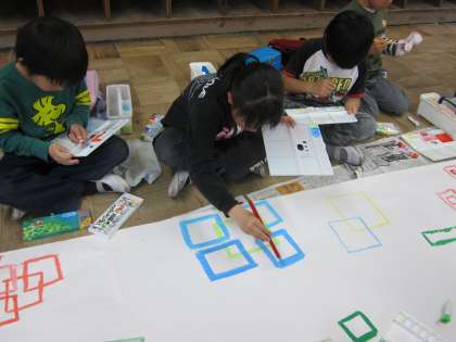 4月の図工の学習で造形遊び『大好き自分の線と色』の学習をしました。想像したことを表現することを通して,絵の具の使い方や色のつくり方など絵画の技能面を習得することをめあてとしています。教科書では画用紙に描くのですが,今回は造形遊びということで,2グループに分かれ,模造紙をつなぎ合わせた大きな紙にみんなで描きました。「カクカクの世界をつくろう」ということで,皆様々な四角形を組み合わせ,美しく見える並べ方や色づかいを工夫しながら,パレットや筆を使うことができました。