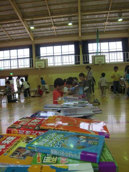 本がずらっとならんだ体育館に入ると子どもたちから「うわあ」と歓声があがっていました。本を選ぶのは本当に楽しそう。これを機会にもっともっと本に親しんでもらいたいと思います。