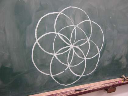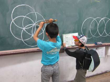 算数の時間にコンパスを使った学習があります。ある日の放課後,学級の子どもが黒板用の大きなコンパスを使ってみたいと言ってきました。何にでも好奇心が芽生える時期です,快くオーケーすると,お友達と教科書を見ながらああでもない,こうでもないと相談が始まり,あれよあれよというまに黒板にきれいな模様ができあがりました。学習ではまだ習っていない内容でしたが,自分達で描き方も見つけたようです。興味や関心は子どもの学習にとても大きなものだと改めて感じました。
