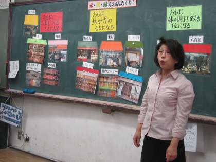 子ども達は色々な食べ物を分類する活動を通して,くわしく栄養の働きを知ることができました。実際のお店の写真が出てきたり,たくさんの食べ物のカードを自分達で分類したりと,岡本先生のお話に皆興味津々といった様子で,意欲的に学習に参加することができました。