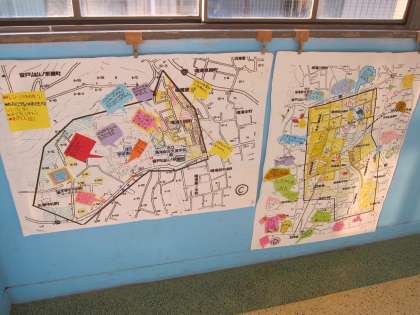 社会の学習でつくっていた校区地図ができあがりました。住宅やお店等によって色をぬりわけ,探検中のエピソードや見つけたもの,不思議に思った事などが細かく書き込んであります。子ども達の地図づくりの楽しさが伝わってくるものになりました。しばらくの間教室の前に掲示しておきたいと思います。