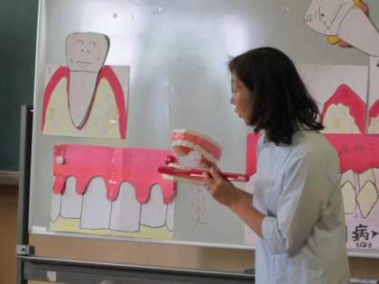 まず、虫歯がなぜできるかを学習し、次に歯だけでなく歯ぐき(歯肉)の大切さについても教えていただきました。しっかり歯みがきをして歯ぐきを大切にしないと、いろいろな病気の原因になることもあるそうです。