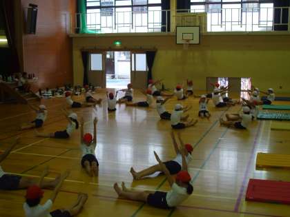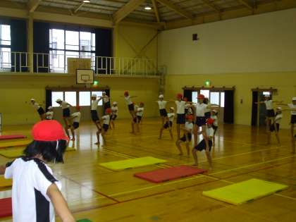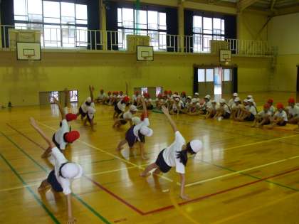 後半は,組体操リーダーさんが考えてくれた振り付けのお披露目をしました。一人技や二人技を組み合わせて考えてくれました。お披露目の後,みんなでやってみたのですが,みんなの動きがそろうとこれもまた見ごたえがありました。