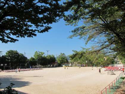 雲ひとつ無いぬけるような青空の下,運動会に向けて今年1回目の全校練習をしました。