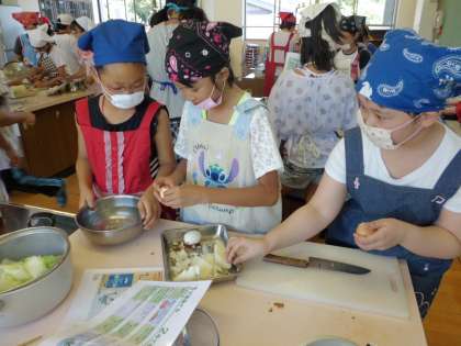 今日の調理実習はゆで卵入りの野菜サラダです。昨日授業で作り方や役割分担をしておいたので今日は「さあ!作るぞ!」とみんな意気込んでいました。始めにゆで卵の準備をして,それからはそれぞれ担当の野菜を切ったりゆでたりと大忙しです。それぞれのグループを見ていると,自分の手があいたときにサッと洗い物をしたり,手伝ったりと6人で協力している姿がたくさん見られました。きれいに盛り付けしたら,ソースをかけて出来上がりです。ソースには隠し味でしょうゆとごま油を入れました。味の変化にみんな「おいしくなった!」と大喜びで食べていました。一生懸命がんばって,協力した味は格別においしかったことでしょう。
