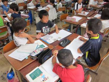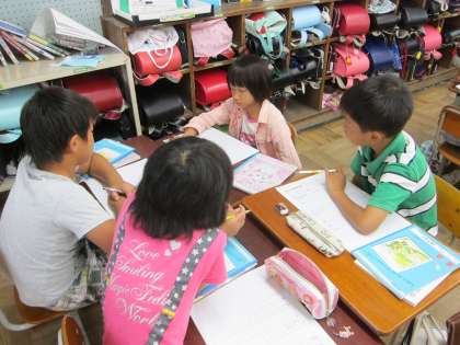 国語「わたしたちの学校行事」の単元で,「こんな行事があったらいいな」をテーマに話し合い活動の学習をしています。司会を中心にアイデアを出し合って話し合いを進めていますが,お祭りやマラソン大会など,どの班も楽しそうな行事を考えて盛り上がっていました。