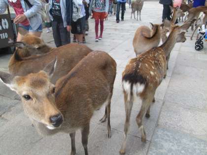東大寺に着くなり,たくさんの鹿が!!「うわ〜」と少し怖がりつつ,でも「さわってもだいじょうぶ?」と興味津々。