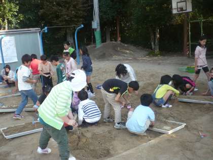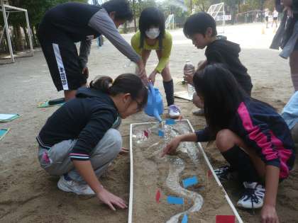 理科で「流れる水のはたらき」を学習しています。今日は,実際に水の流れはどんなはたらきをしているのか実験で調べることになりました。まずは水の流れる道を砂でつくりました。そのあと,水をどんどん流していくと砂や石が流れていったり,水の流れでまわりの砂がけずられたりなど,自然の中で起こっていることが目の前で観察できました。子どもたちからは「堆積や。」「これが侵食なんやな。」「運搬も見られるで。」と理科で教わった言葉を使って話していました。自分たちが見たことのある川のように中州ができたり,川が途中から分かれたりする様子に感動しながら学習できました。