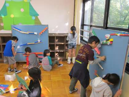 図工の時間に色々な材料を使ってビー玉を楽しく転がす仕組みを考える工作をしました。9グループに分かれてそれぞれのグループでついたてに転がるコースを立体的にくっつけていきます。