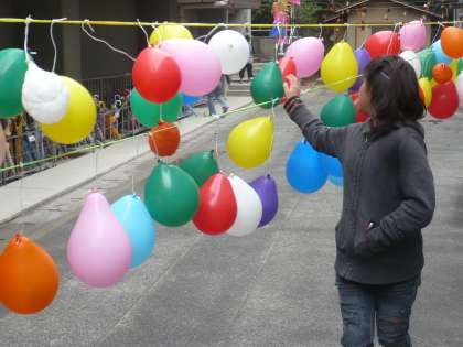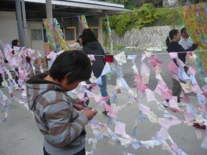 図工の学習で「風をすてきに見せよう」という題材に取組みました。見えない風をすてきに見せるとしたら・・・どんな方法があるのかみんなで話し合い様々な方法を思いつきました。そこから,グループで材料や場所を決めて活動を始めました。活動を進めるごとに工夫も増えていき,中庭に風が吹くと「わあ!きれいやな。」「動き方がおもしろい。」「色もいいね。」と歓声が上がりました。とても楽しい活動ができました。