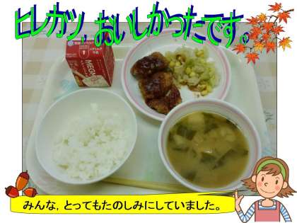 11月の勤労感謝の日にちなんで,今日は,給食感謝の献立「ごはん・牛乳・ヒレカツ・ソティ・みそ汁」の献立でした。子供たちには大人気の給食でみんなおいしくいただくことができました。