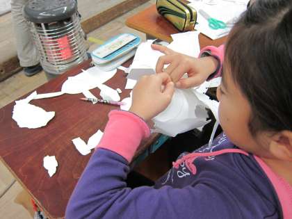 さて,あっという間にやってきた今年最後の授業日の今日,3年生の子たちが版画にするための版を白い画用紙でつくっていました。