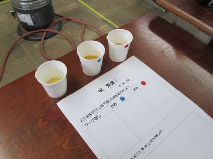 今日は,その味を味わおうと,岡本先生にいろいろなだしを用意していただき,みんなで味見をしました。やはり,京都に住む子どもたちなので,だしを飲んで「おいしい!」「これは,昆布の味や!」「これは,甘い気がする。」「いつものうどんの味や!」と。昆布だしとかつおだしを合わせるとまたまた味が変わり,さらにおいしくなりました。
