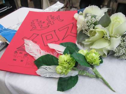 二つ目は,おうちの方が「結婚式場面に使ってください」と用意してくださった花嫁のベールにつける花飾りが,本番でどこにあるか分からず,あたふた・・・。結局なしで劇を進めることに・・・。みんなで分担して小道具も持って行ったのですが,その引き渡しがうまくできずに始まってしまったようで・・・。とても素敵なものだったのに,本当に残念です(本当に申し訳ありません・・)。でも,もう一つのブーケは,結婚式に華を添えてくれました。(ぜひ,写真で見てください。)