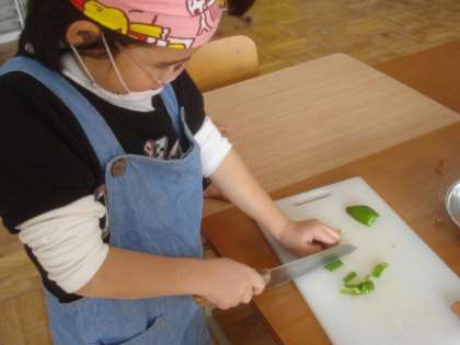 14日(木),2月生まれのお友達2人の誕生日会をしました。今回のごちそうは,「スパゲティナポリタン」と「プリン」です。子どもたちは包丁の扱いにだいぶ慣れ,野菜を切るのが早く,きれいになってきています。誕生日の子は,出来上がったナポリタンを食べながら,「これ好き〜」と言っておかわりまでしていました。