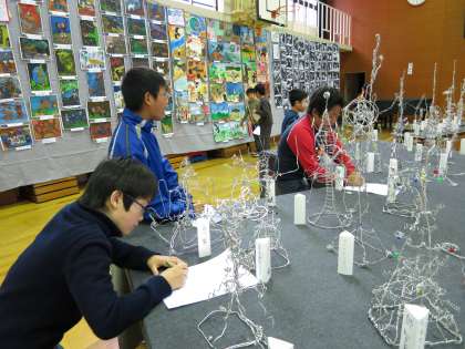 小学校の体育館で行われている図工展で,これまでおたよりでお知らせしていた“タワーを立てよう”を展示しています。3種類のはりがねを使って,巻いたり,ひねったりしながら一人一人,オリジナルのタワーをつくっています。タワーの名前を見ながら,作品を鑑賞してもらうとより楽しんでもらえると思います。また,版画やお話の絵も展示しています。27日(水)までです。ぜひ,お越しください。