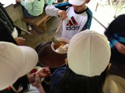 手作りのカレーライスのできあがりです。お家や学校とはひと味違うカレーライスになったことでしょう。「協力」というすばらしいスパイスが入っています。