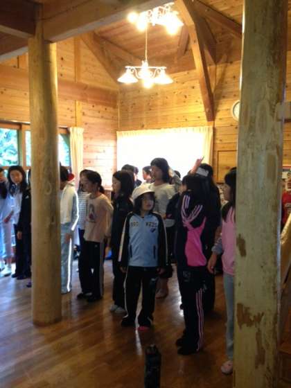 子どもたちはロッジに戻りました。夕食前の時間を使って,各クラスの今夜のキャンプファイアーの出し物の練習をこっそりしています。だんだんと気分が盛り上がってきました。楽しみです。