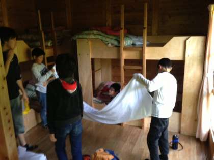 今までお世話になったロッジの後片付けです。シーツや布団をたたみ部屋の掃除をします。