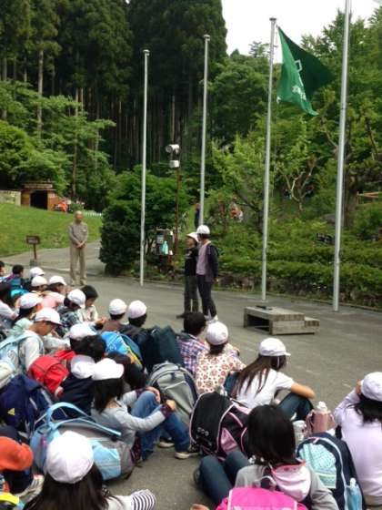 山の家での最後の活動。退所式です。山の家の先生方とハイタッチでお別れしました。