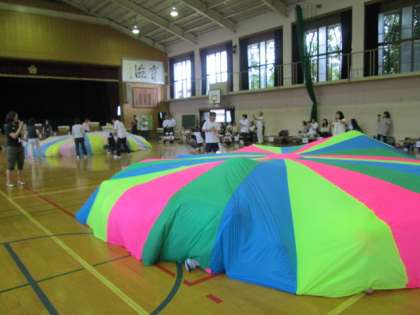20(木)の午前中、右北支部育成学級の合同運動会が嵯峨小学校の体育館で行われました。「よういどん!」で力いっぱい走ったり、「ごろごろ とことこ ぐーるぐる」で跳び箱やブロックなどの遊具を飛び越えたりと、たくさん体を動かしました。