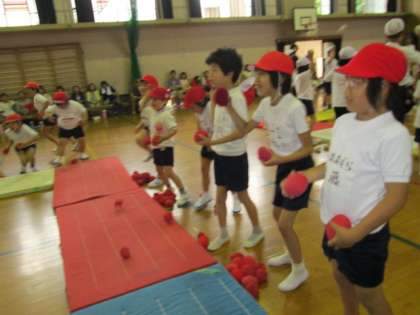 最後に、赤組と白組に分かれて玉入れを行い、3回戦にわたる接戦にて運動会は終了しました。片付けの後は、みんなで輪になってお弁当を食べました。保護者の皆様には、お弁当のご準備や応援に来ていただき、ありがとうございました。