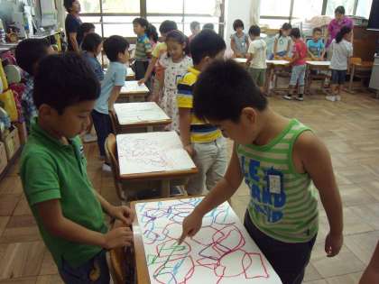 今日は9月11日の校内研究の事前授業がありました。子ども達は自分がみつけたかげを友達にみせてお話をしながら、友達のかげの形の面白さをみつけていました。この授業はかげに関する絵本の読み聞かせやかけクイズをした後に、運動場や花道の自分が好きな影の形を写し取って、友達と見せ合います。さあ、どんな授業に仕上がっていくか楽しみです。