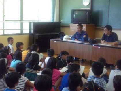 社会の学習で消防分団の方に学校へ来てもらい、お話を聞いた後、消防分団の部屋の中もみせていただきました。子ども達もどんどん手をあげて質問していました。