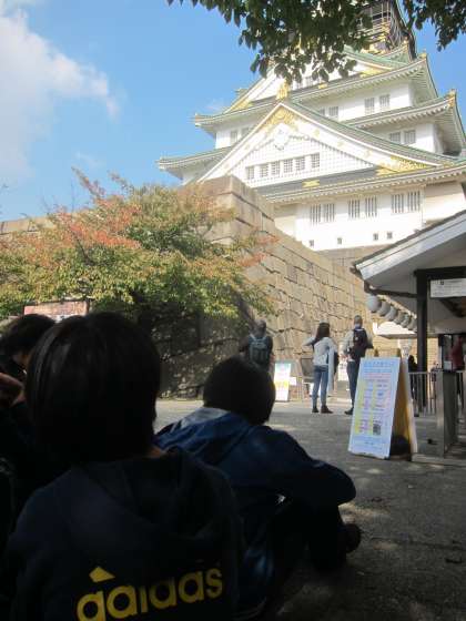 まず大阪城では天守閣から大阪の街並みを眺めました。その後に「大阪城謎解きツアー」に挑戦しました。駆け足の見学になりましたが,子どもたちは班で協力しながら「豊臣秀吉の昔の名字は?」「大阪城はなんという戦いで滅びたのか?」「豊臣秀吉が懐に入れて温めたものは?」などの問題を解いていました。