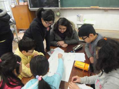 クラスごとに分かれて交流をしました。前半は,日本の遊びを紹介しました。「すごろく」「けん玉」「お手玉」「わりばしてっぽう」などのいろいろな遊びをゲストと子どもたちが一緒になって楽しみました。子どもたちはそれぞれの遊びのやり方を英語を交えながら説明していました。