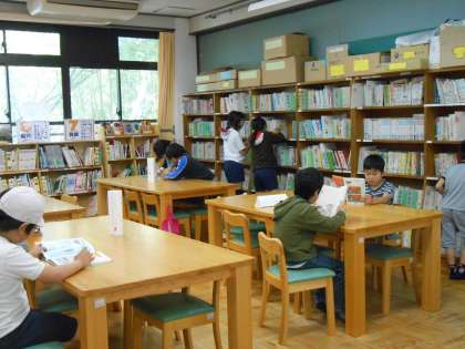 図書館に新しい看板をかけました。休み時間にたくさん来てくれています。