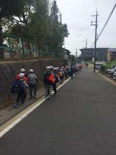 まず,宇多野小学校のピロティーで出発式を行い,それから,仁和寺前まで歩いて,京都バスに乗車します。みんな元気で出発しました。
